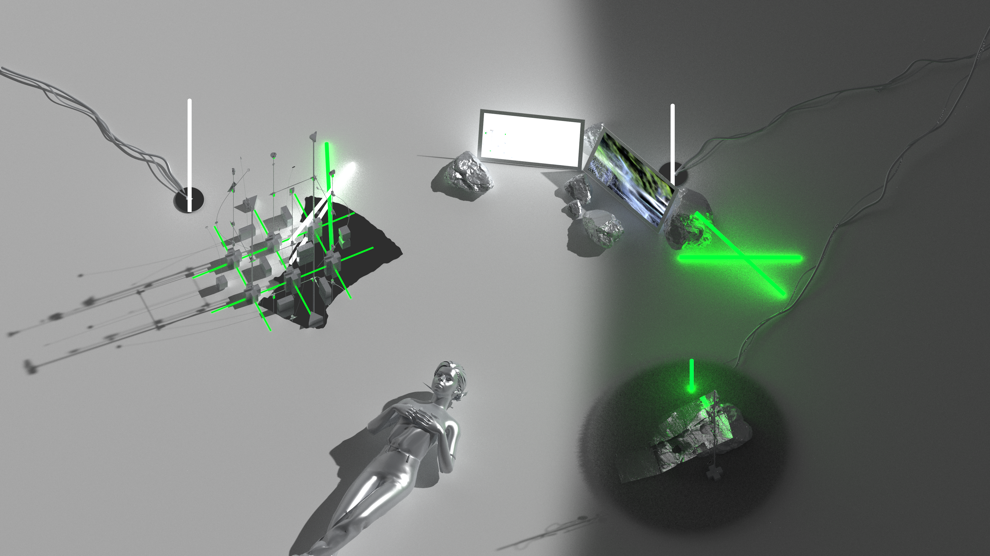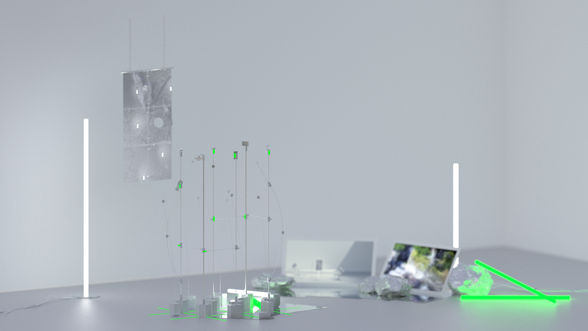 Architecture is a medium for sensing the urban environments going under profound ecological and technological shifts. The central installation, resembles a scaffolded structure holding geological samples, subtly moving with each interaction and mirroring both the dynamic visualizations and the ongoing transformation of the site. The samples, sourced from the mountain itself, are 3D-scanned and printed. Marked by traces of human intervention [arches, gates, and etched surfaces] they appear as future fossils, bearing witness to the reciprocal relationship between architecture and geology.